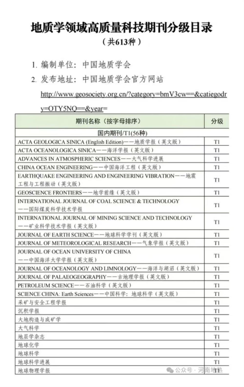 地球科学领域高质量科技期刊分级目录由中国地质学会、中国地球物理学会、中国岩石地球化学学会、中国地震学会、中国古生物学会、中国石油学会、中国煤炭学会、中国海洋学会、中国气象学会、中国天文学会编制。