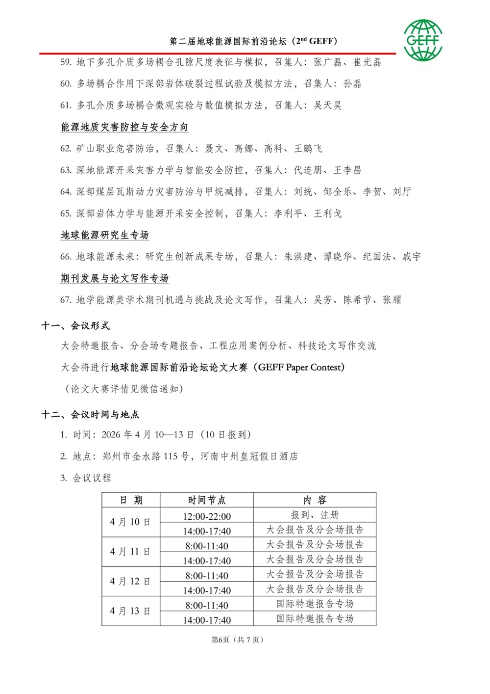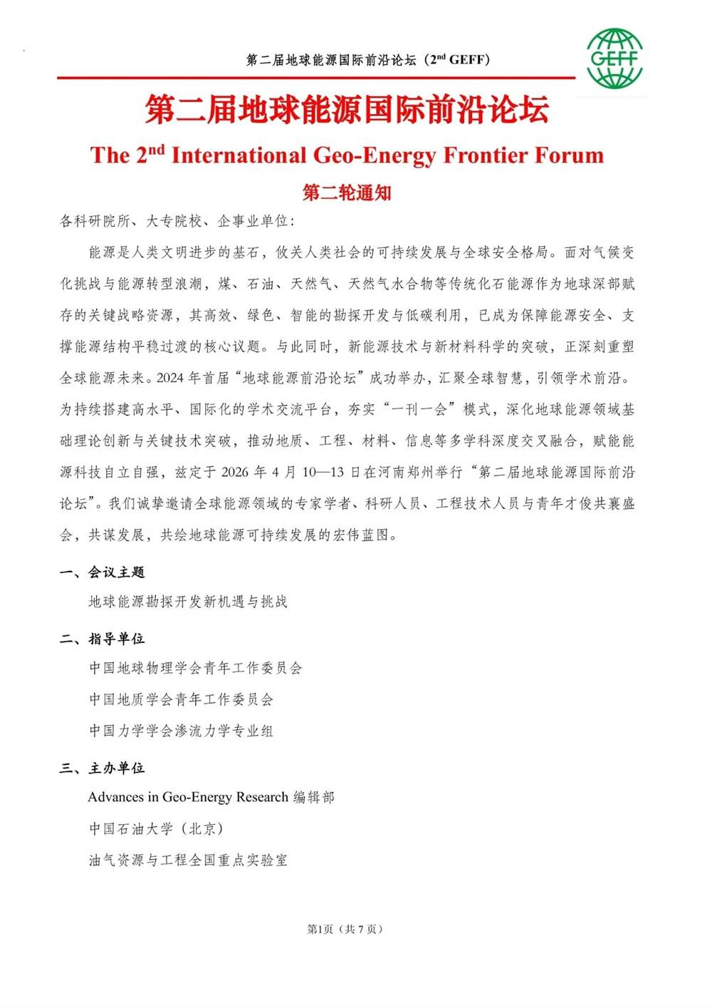 能源是人类文明进步的基石,攸关人类社会的可持续发展与全球安全格局。面对气候变化挑战与能源转型浪潮,煤、石油、天然气、天然气水合物等传统化石能源作为地球深部赋存的关键战略资源,其高效、绿色、智能的勘探开发与低碳利用,已成为保障能源安全、支撑能源结构平稳过渡的核心议题。与此同时,新能源技术与新材料科学的突破,正深刻重塑全球能源未来。2024年首届“地球能源前沿论坛”成功举办,汇聚全球智慧,引领学术前沿。为持续搭建高水平、国际化的学术交流平台,夯实“一刊一会”模式,深化地球能源领域基础理论创新与关键技术突破,推动地质、工程、材料、信息等多学科深度交叉融合,赋能能源科技自立自强,兹定于2026年4月10—13日在河南郑州举行“第二届地球能源国际前沿论坛”。我们诚挚邀请全球能源领域的专家学者、科研人员、工程技术人员与青年才俊共襄盛会,共谋发展,共绘地球能源可持续发展的宏伟蓝图。